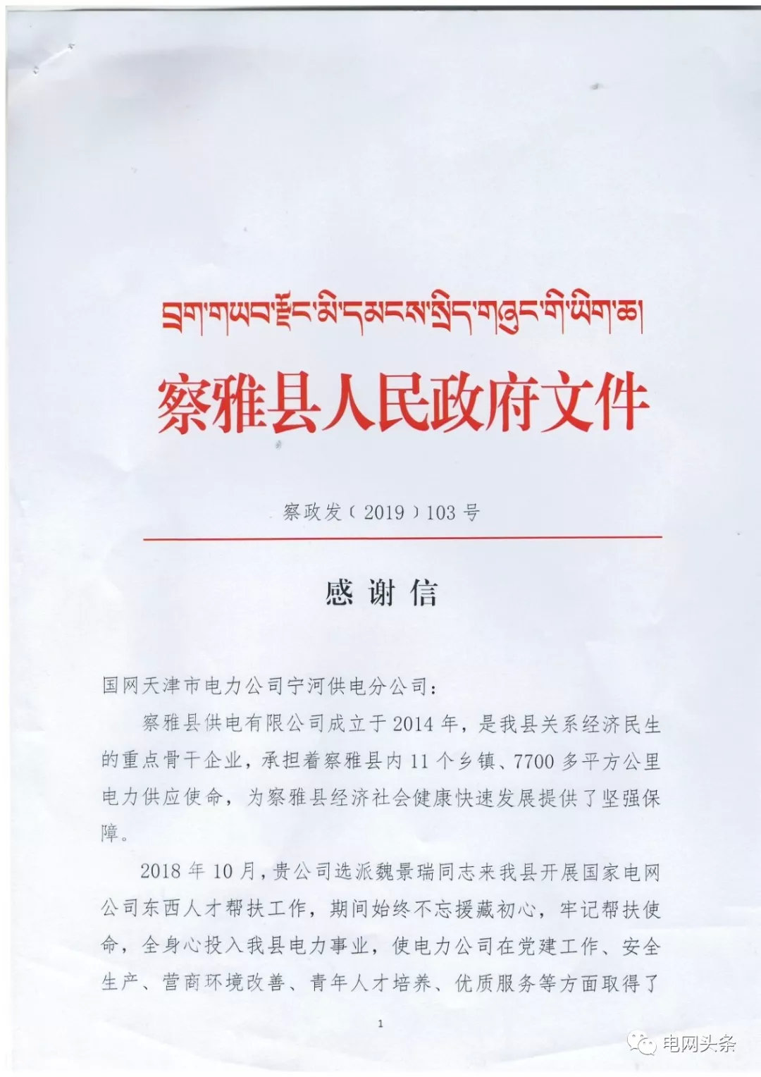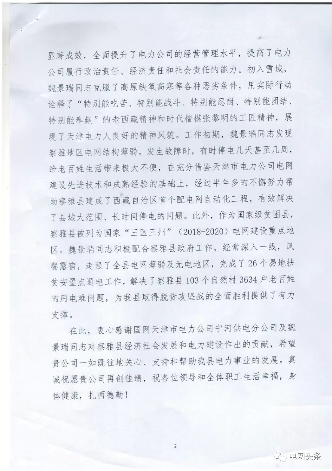 打開一看,居然是一封感謝信:“衷心感謝國(guó)網(wǎng)天津市電力公司寧河供電分公司及魏景瑞同志對(duì)察雅縣經(jīng)濟(jì)社會(huì)發(fā)展和電力建設(shè)作出的貢獻(xiàn),真心祝愿貴公司再創(chuàng)佳績(jī),扎西德勒!”