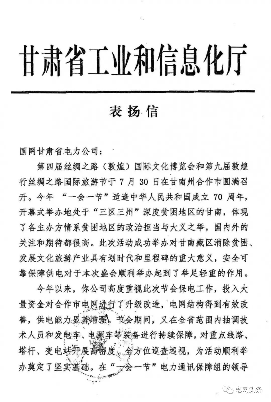 近日,甘肅省工業(yè)和信息化廳發(fā)來(lái)感謝信,對(duì)國(guó)網(wǎng)甘肅電力在“一會(huì)一節(jié)”供電保障中所做的各項(xiàng)工作和精心組織策劃應(yīng)急保障演練活動(dòng)表示認(rèn)可和感謝: