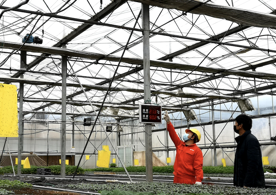 國網(wǎng)重慶電員工為育苗大棚電力線路進行用電安全檢查。