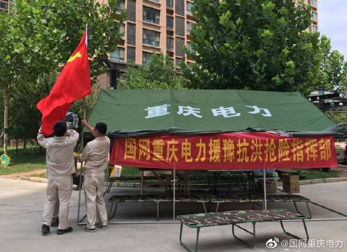 【搭起帳篷安營扎寨 他們說:不通電就不撤退】7月27日,完成鄭州濱河花園小區(qū)復電工作后,國網(wǎng)重慶援豫抗洪救災紅巖共產(chǎn)黨員服務隊來到河南大學明德園小區(qū)開展搶險保供電工作,他們搭起一頂頂帳篷安營扎寨,服務隊長范昭勇表示:“不通電,不撤退!” ????